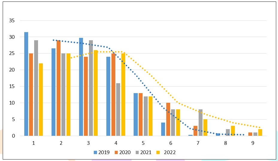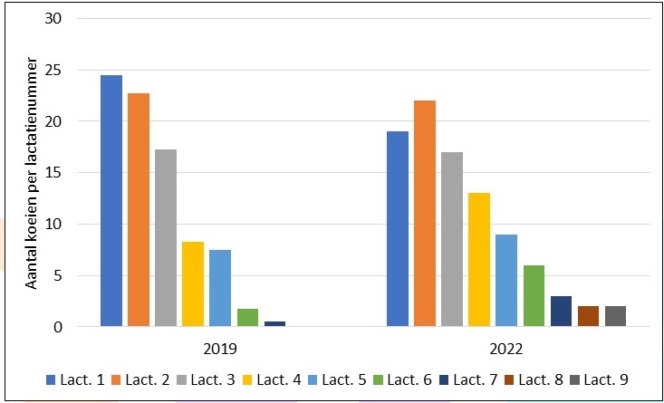 In de figuur hiernaast staan de aanhoudingsprofielen/leeftijdsopbouw van een praktijkbedrijf uit de pilot Geef-ze-de-vijf! in 2019 en 2022 nadat vanaf 2019 gericht maatregelen zijn getroffen om de levensduur te verlengen. Het aantal vaarzen is afgenomen en vanaf de 3e lactatie neemt het aantal koeien per lactatienummer toe. De afvoerlijn verloopt minder steil en het aantal oudere koeien is duidelijk toegenomen. Het voordeel van deze manier van beoordelen is dat direct zichtbaar is of het bedrijf is gegroeid, met een lagere gemiddelde leeftijd tot gevolg, maar dat de verduurzaming toch duidelijk in beeld komt door de toename van de oudere koeien. Ook zonder dat de afvoerleeftijd is toegenomen.