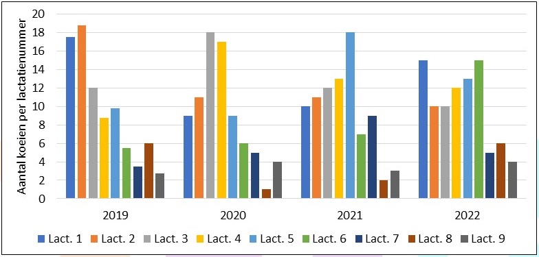Wat we in de praktijk ook zien is dat er soms een “stuwmeer” aan oude koeien ontstaat wanneer maatregelen ertoe leiden dat nauwelijks nog jonge koeien uitvallen. Ze schuiven dan geleidelijk aan bijna allemaal door naar de latere lactaties waardoor er moment komt dat er veel oude koeien zijn met een verhoogd risico op uitvallen. Daar moet je op tijd op inspelen om te voorkomen dat je dan te weinig jongvee hebt als er ineens veel koeien afgevoerd moeten worden. De kunst is om het koppel op den duur in evenwicht te krijgen.
