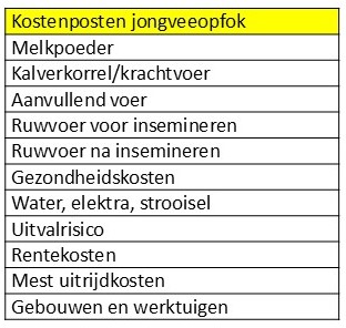 • De kosten voor poedermelk, krachtvoer, ruwvoer, mineralen, additieven, medicijnen, dierenarts, inseminatiekosten, huisvesting, diverse voorzieningen.