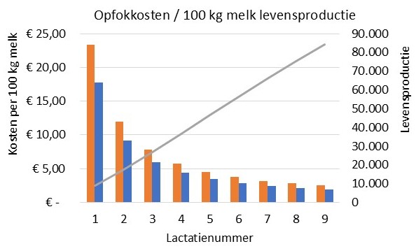 Een langere levensduur betekent lagere opfokkosten per 100 kg levensproductie. En ook per levensjaar. In de figuur rechts is dat weer gegeven voor de opfokkosten inclusief arbeid (oranje kolommen) en exclusief arbeid (blauwe kolommen). Er is uitgegaan van totale opfokkosten van €1.650 exclusief arbeid en €2.100 inclusief arbeid. In de eerste lactaties dalen de kosten per kg melk meer dan lineair. Uiteindelijk worden de opfokkosten per 100 kg melk zeer laag (€1,96 per 100 kg melk excl. arbeid, €2,49 incl. arbeid)). Op bedrijfsniveau wordt dat nog minder omdat er minder dan één stuks jongvee per koe aanwezig is. Als de hogere opbrengsten uit verkoop van jongvee worden meegenomen wordt het nog minder. Gezien het kleine effect van een bezuiniging op de opfokkosten op het totale economische resultaat en het effect van levensduur en levensproductie kan beter niet zonder meer op de opfokkosten worden bezuinigd. Kwaliteit voor levensduur staat voorop.