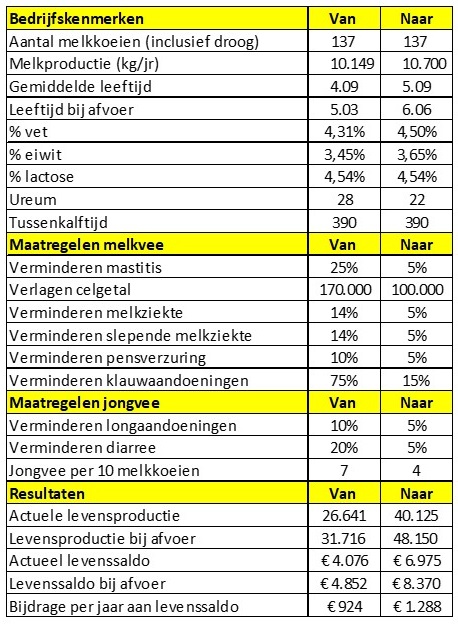 In de tabel een voorbeeld van een aantal verbeteringen op een melkveebedrijf en de resultaten voor levensduur, levensproductie en economie. Onderdeel van het economisch resultaat is de verminderde melkderving. Voor een bedrijf met 100 stuks melkvee met een lage gemiddelde leeftijd vanwege gezondheidsproblemen, is de derving al gauw 50.000 kg melk en een vermindering met 30.000 kg door duurzaamheidsmaatregelen is in de praktijk goed haalbaar. De economische effecten zijn dus aanzienlijk. Voor de economische berekeningen in de tabel is uitgegaan van de meerjarige voortschrijdend gemiddelde melk- en voerprijzen  (Bron: RFC, WUR, Valacon, 2019). De gemiddelde leeftijd is door diverse gezondheidsmaatregelen met een jaar toegenomen. Door de betere gezondheid, de lagere melkderving en minder stuks jongvee is het levenssaldo, dat wat een koe netto heeft opgeleverd, met enkele duizenden euro’s gestegen. Omgerekend per levensjaar hebben de koeien bij afvoer ruim €360,- meer opgebracht.