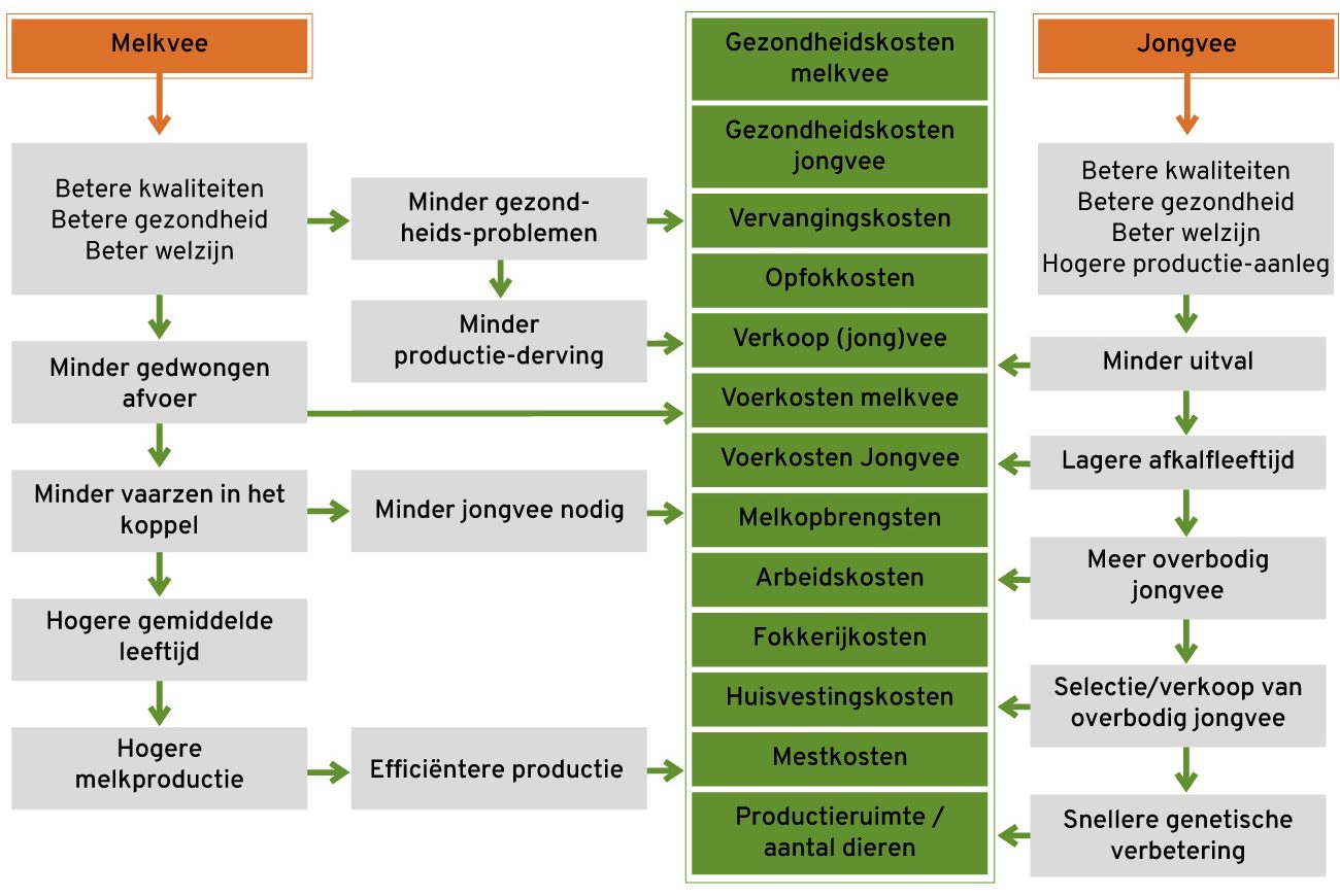 In de figuur een schematische weergave van de relatie tussen levensduur en economie. Maatregelen bij het melkvee en het jongvee voor het verbeteren van de levensduur, en de levensduur zelf, hebben gevolgen voor de kosten en baten op verschillende onderdelen van het bedrijf.