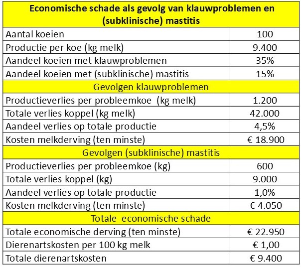 Rekenvoorbeeld van de economische schade van (subklinische) mastitis en klauwproblemen (diverse bronnen)