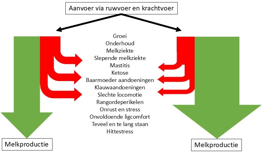 • Als gevolg van de problemen wordt een deel van de opgenomen energie uit voer gebruikt voor afweer en herstel en is dus niet beschikbaar voor de melkproductie.