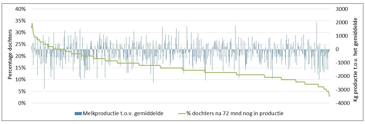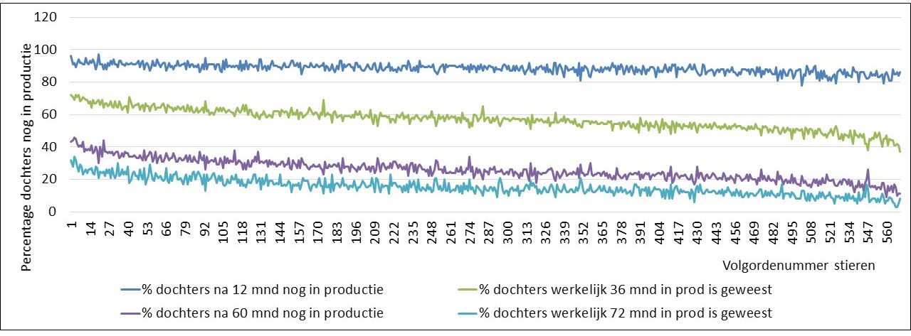 In Nederland wordt van de stieren bijgehouden hoeveel dochters er na een bepaald aantal jaren nog in productie zijn, vanaf de eerste keer dat ze afkalven tot 7 jaar daarna. Dat is een zeer waardevolle bron van informatie over de levensduur. Het is tenslotte het echte bewijs van de levensduur van de dochters en dus met een maximale betrouwbaarheid. Dat is een welkome aanvulling op het gebruik van de genomicsfokwaarden die de nodige onzekerheden kennen.