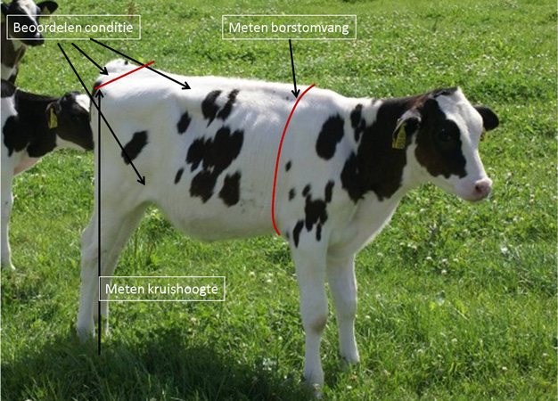 Bij kalveren onderscheiden we groei (gewicht en conditie) en ontwikkeling van het skelet (vorm en hoogte). Kalveren met een matig ontwikkeld skelet groeien “vol”. Dat worden ook wel  “propjes” genoemd. Kalveren met een goed ontwikkeld skelet zijn vaak slanker. Wat niet hetzelfde is als smal of mager. Om de juiste leeftijd voor insemineren te kunnen bepalen moeten deze verschillende aspecten worden meegenomen bij het meten van de kalveren. Door de kalveren op verschillende manieren te beoordelen wordt een goed totaalbeeld verkregen van de groei en ontwikkeling.