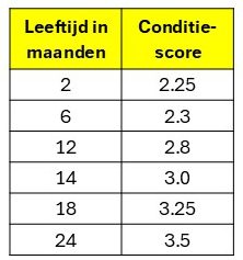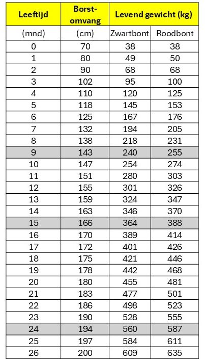 Bij de tabel. Borstomtrek en daarbij berekend gewicht op verschillende leeftijden bij jongvee. De gewichten zijn exclusief dracht (10 kg in de 7e, 25 kg in de 8e en 35 kg in de 9e maand van de dracht). (Bronnen: Dpt Landbouw en Visserij Vlaamse Overheid, CVB, Vetvice, CR-Delta).