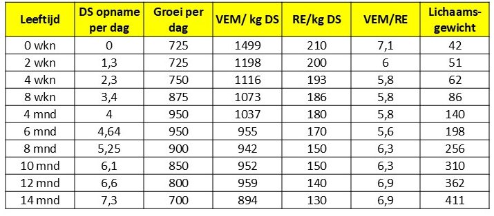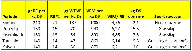 Voorbeeld van en voerschema met ruwvoer met RE-gehalte, VEM/kg drogestof en drogestof opname voor een afkalfleeftijd van 24 maanden (Bron: Schothorst Feed Research, 2012). De verhouding en de hoeveelheid eiwit in het rantsoen is van wezenlijk belang voor de groei en ontwikkeling. Hoe meer ruwvoer hoe onzekerder het wordt als geen goede analyses beschikbaar zijn.