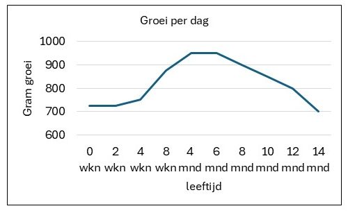 • Vanaf de dracht mag de groei terug naar ongeveer 250 gram per dag op afkalfleeftijd;