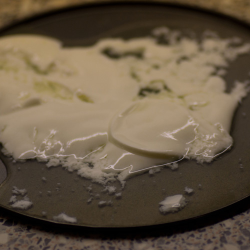 Bij een goede stremming van de melk is er door de tragere passage in het kalf meer tijd voor de voorvertering en de benutting. Een goede voorvertering vraagt 5 tot 8 uur. Van links naar rechts: gestremde koemelk, een MMP-product van goede kwaliteit, een MMP-product van mindere kwaliteit, een 0-product dat nauwelijks stremt.