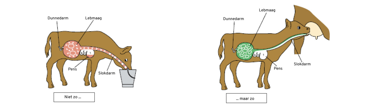 Een kalf wordt “geprogrammeerd”. De eerste kennismaking met vorm, geluid, smaak en kleur wordt als het ware ingeprent. Als je daar geen rekening mee houdt, kan het werking van de slokdarmsleuf en de opname verstoren. Gebruik daarom bij voorkeur steeds dezelfde kleur emmer, speen, concentratie etc.