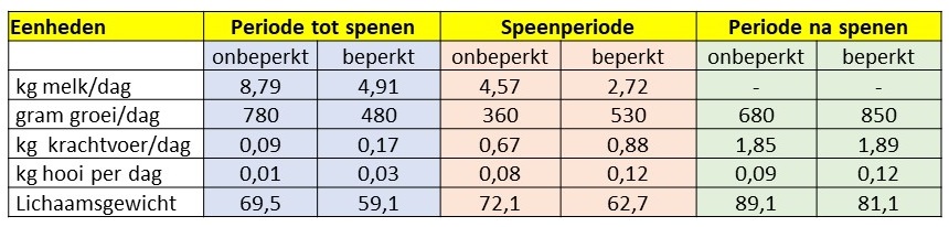 Gemiddelde voeropname en groei van kalveren bij beperkte en bij onbeperkte melkgift. De hogere groei (+300 g/dag) bij de onbeperkte melkgift resulteert in een hoger gewicht maar die voorsprong (10,6 kg) neemt af na spenen (8 kg) omdat bij een beperkte melkgift de ruwvoeropname hoger is. Uiteindelijk (na ruim 60 dagen) waren de onbeperkt gevoerde kalveren desondanks zwaarder (Bron: Jasper e.a. 2002).. Een goede groei in de melkperiode uit zowel (onbeperkt) melk, krachtvoer als ruwvoer garandeert de beste ontwikkeling na spenen.