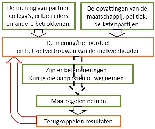 Er zijn verschillende factoren die invloed hebben op de opvattingen van melkveehouders. In grote lijnen is dat iedereen uit de omgeving die direct of indirect zijn mening laat horen. Hoe grotere de druk die daarvan uitgaat, hoe groter de kans is dat iemand maatregelen neemt die eigenlijk niet passen bij zijn eigen overtuiging. Als gedrag en opvattingen niet op elkaar aansluiten, is dat geen prettig gevoel. Het kan zelfs stress opleveren en de neiging bestaat om gedrag of opvattingen aan te passen om ze op elkaar aan te laten sluiten. Het is belangrijk om deze zogenaamde “cognitieve dissonantie” weg te nemen. En daarvoor moet je de melkveehouder kennen. Hoe meer iemand overtuigd raakt van zijn eigen opvattingen en mogelijkheden, hoe gemotiveerder hij is om actie te ondernemen en eventuele belemmeringen uit de weg te ruimen of te omzeilen. Als dat oplevert wat hij had verwacht, nemen zijn zelfvertrouwen en zijn motivatie verder toe.