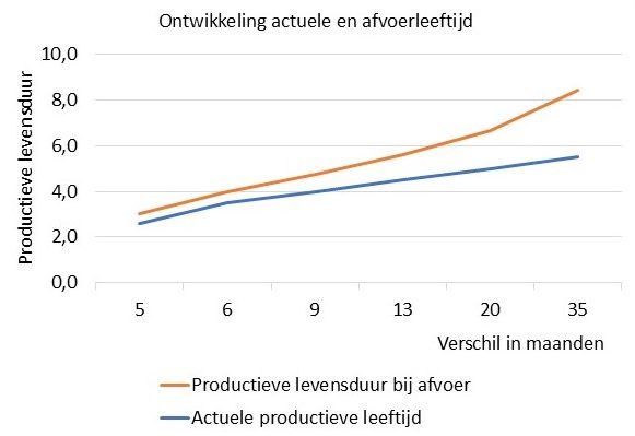 De grafiek rechts van een groot aantal koeien laat zien dat afvoerleeftijd sneller toeneemt dan de gemiddelde leeftijd. Bij een gemiddelde leeftijd van 4 jaar en 8 maanden is de afvoerleeftijd rond 5 jaar en 8 maanden. Een verschil van ongeveer een jaar. Bij een gemiddelde leeftijd van 7 jaar loopt het verschil op naar ca. twee jaar. Aan de hand van de gemiddelde actuele leeftijd op de MPR, kun je los van de jaarlijkse schommelingen, voor de langere termijn een inschatting van de afvoerleeftijd maken door ook rekening te houden met het aandeel oude koeien die grote kans lopen afgevoerd te worden. Grotere (jaarlijkse) verschillen op het MPR-jaaroverzicht worden veroorzaakt door bijvoorbeeld afvoer van veel vaarzen (verschil tussen gemiddeld en afvoer kleiner) of koeien met een zeer hoge levensproductie (verschil groter). Door het verschil in maanden levensduur aan de hand van de rollend jaargemiddelde productie om te rekenen kun je de levensproductie inschatten. Bij een jongere veestapel heeft verlaging van de uitval met 30% minder effect op de levensduur dan bij een ouder koppel.
