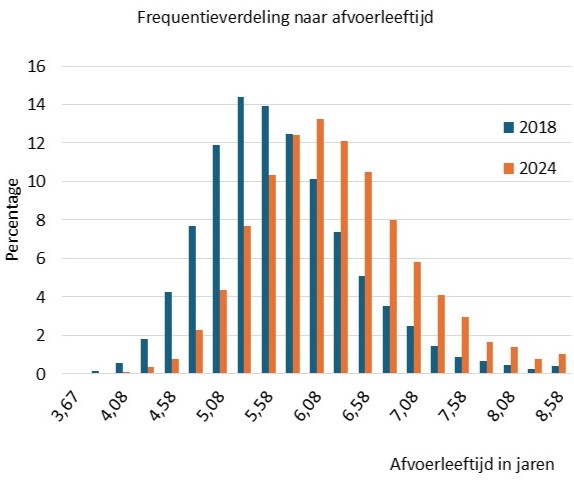 De sector heeft zich als doel gesteld dat in 2025 minimaal 70% van de bedrijven de gemiddelde afvoerleeftijd van de koeien in 2018 zou moeten bereiken ofwel 5 jaar 8 maanden en 20 dagen (5,6 jaar). In 2030 moet dat minimaal 90% van de bedrijven zijn. In 2018 lag zo’n 75% van de bedrijven onder dat gemiddelde en in 2024 ruim 25%. In de rechter figuur is dat weergegeven. Er is dus flinke voortgang geboekt. Dat betekent dat ruim 10% van de bedrijven de levensduur verder zal moeten verlengen. Per bedrijf kan dat uiteenlopen van een maand tot wel twee jaar. In de tabel links is te zien dan de verlengingstrend afzwakt dus we zullen nog een tandje bij moeten schakelen.
