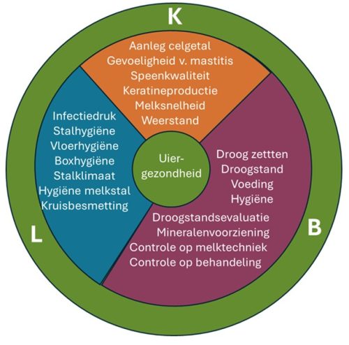 Ook voor de uiergezondheid kunnen we het KBL-principe hanteren: de genetische aanleg van de koe (K) verbeteren, de bedrijfsvoering (B) optimaliseren en de Leefomgeving (L) aanpassen. Uiergezondheidsproblemen kunnen hardnekkig en structureel zijn en een goede aanpak vraagt inbreng vanuit die drie vakgebieden. Waar moet je bij de fokkerij op letten? Hoe kun je via de voeding en verzorging een bijdrage leveren en met welke maatregelen in de stal kun je een bijdrage leveren? De uiergezondheid speelt zowel in de droogstand en de lactatie.