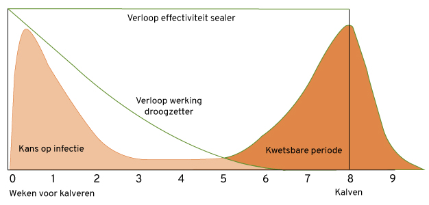 Verloop van de werking van een droogzetter en de effectiviteit van een sealer gedurende de droogstand en de kans op infectie in de droogstand. De kans op infectie neemt met een droogzetter in eerste instantie sterk af maar neemt in verloop van tijd weer toe. Als de droogzetter is uitgewerkt breekt een kwetsbare periode aan. Een sealer blijft werkzaam over de gehele periode.