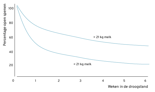 Voor een goed herstel van de biologische functies is een droogstand van ca. 45 dagen voldoende. Als ideale lengte wordt onder de Nederlandse omstandigheden 50 tot 70 dagen aangehouden maar het varieert sterk. Uit praktijkonderzoek op Amerikaanse bedrijven is gebleken dat vaarzen in de 2e lactatie beter produceren bij een iets langere droogstand (60 dagen). Een (te) lange droogstand kan een te ruime conditie bij afkalven in de hand werken. Korter dan 6 weken of langer dan 8 weken verlaagt bij meerkalfs koeien de productie al snel met een paar procent. Waar exact het keerpunt ligt, is afhankelijk van de situatie op het individuele bedrijf en de mogelijkheden om tussentijds bij te sturen. Hoe langer de droogstand, hoe groter de kans op afvallen of vervetten. Onder normale omstandigheden is 6 weken voldoende. Omdat er zich toch vaak problemen voordoen rond de droogstand, met name als koeien eind lactatie teveel produceerden of een te ruime conditie hadden, kwam de vraag of en in hoeverre droogzetten noodzakelijk is.