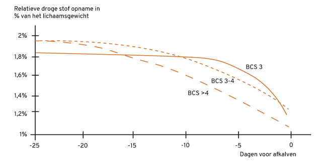 Figuur 4.1.4. DS-opname in procenten van het lichaamsgewicht bij drie verschillende Body Condition Scores: schraal (BCS <3), gemiddeld (BCS 3 tot 4) en vet (BCS >4). Bij een te ruime conditie kan de voeropname sterk afnemen en zal de negatieve energiebalans (NEB) sterk toenemen. Bij een zeer ruime conditie kan verminderde voeropname al 3 weken voor afkalven inzetten. De negatieve energiebalans met de bijbehorende problemen met leververvetting en slepende melkziekte beginnen dan al ruim voor het afkalven. Bij een lagere BCS blijft de voeropname langer op niveau en wordt de NEB minder diep (Bron: Grummer, 2000).