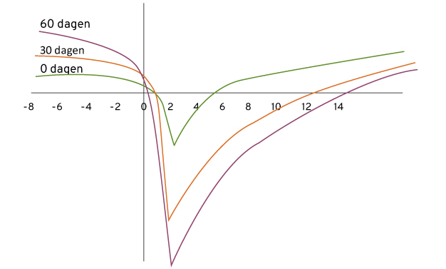Schematisch verloop van de energiebalans bij 60 dagen, 30 dagen en 0 dagen droogstand. Hoe langer de droogstandsperiode, hoe dieper de negatieve energiebalans en hoe groter de kans op de daarbij behorende problemen. Bij een relatief korte of geen herstelperiode kunnen zich mogelijk op den duur weer andere problemen voordoen die we nu nog onvoldoende in beeld hebben (Bron: A. van Knegsel et al., 2012).