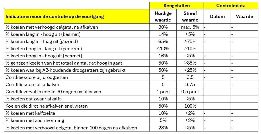 De eerste stap is het stellen van een doel. Het doel van de droogstand is dat een koe geheel herstelt, dat ze in de juiste conditie is en blijft zodat ze makkelijk afkalft en opstart. En met een laag celgetal uit de droogstand komt. Het gaat dan vaak om meerdere aandachtspunten zoals de voeding, de hygiëne en het conditieverloop en dus ook meerdere soorten maatregelen. Er zijn dus ook meerdere kengetallen die een beeld geven van het verloop en de kwaliteit van de droogstand. Ter illustratie is, volgens de blauwdruk uit hoofdstuk 2, in de tabel. een voorbeeld gegeven van het hoofddoel en de bijbehorende kengetallen en controlepunten. Voor de optimalisatie van de droogstand is een termijn van een jaar realistisch en daarom zijn de streefwaarden na een jaar weergegeven.