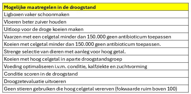 - Houd zo mogelijk hoog celgetal dieren apart tijdens de droogstand;