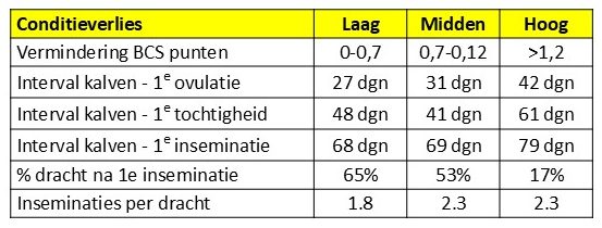 In de tabel de resultaten van een onderzoek naar de gevolgen van conditieverval in de droogstand voor de reproductie. (Bronnen: Butles 2000; Garnsworthy en Webb 2002; Guthrie en West 2003). Met name een hoog conditieverval beïnvloedt zowel de intervallen als het aantal geslaagde eerste inseminaties. De ovulatie komt later, de eerste tocht komt later en uiteindelijk duurt het langer voordat de koe drachtig is.
