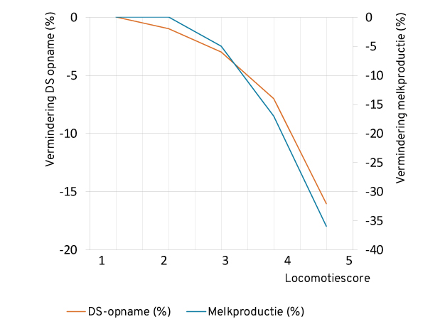 Relatie tussen de locomotiescore, de droge stofopname en de melkproductie. Een score van 4 verlaagt de voeropname met ca. 10% en de productie met ca. 15%. Bij een score van 3 daalt de productie sneller dan de voeropname. Dat geeft extra problemen (Bron: Robinson, 2001).