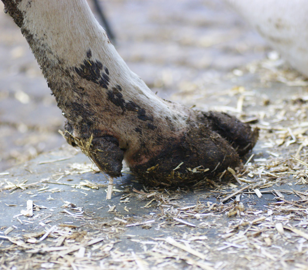 | Ziekte van Mortellaro (Italiaanse stinkpoot) | Besmettelijke aandoening. Vaak op overgang hoorn naar huid op de achterzijde van het achterbeen. Meest bekende verschijningsvorm is een rode “aardbei”, maar ook soms met haren. Pijnlijk, met kreupelheid. | Veroorzaakt door de bacteriën Bacteroides nodosus, Fusobacterium necrophorum en anaerobe bacterieën (oa Spirocheten). | Insleep via aankoop Natte vloeren of plaatsen waar de koeien doorheen moeten lopen. Platte klauwen, lage verzenen, hoge lucht-vochtigheid in de stal, kiemdruk. |