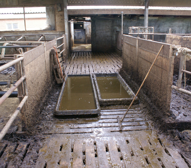 - Komen de koeien na het voetbad op een droge, schone vloer, dan werkt het ontsmettingsmiddel beter en langer. Zet eventueel de (probleem)koeien een tijdje vast. Het middel kan dan langer inwerken.