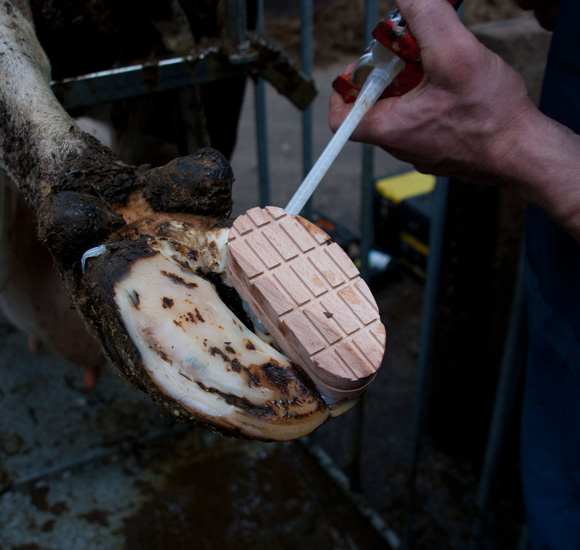 - Korte draaien, bijvoorbeeld bij de melkstal, veroorzaken door frictie wittelijn defect en schade aan de zolen. Zorg dat de koeien makkelijk de hoek om kunnen draaien door op die plaatsen een rubber mat te leggen.