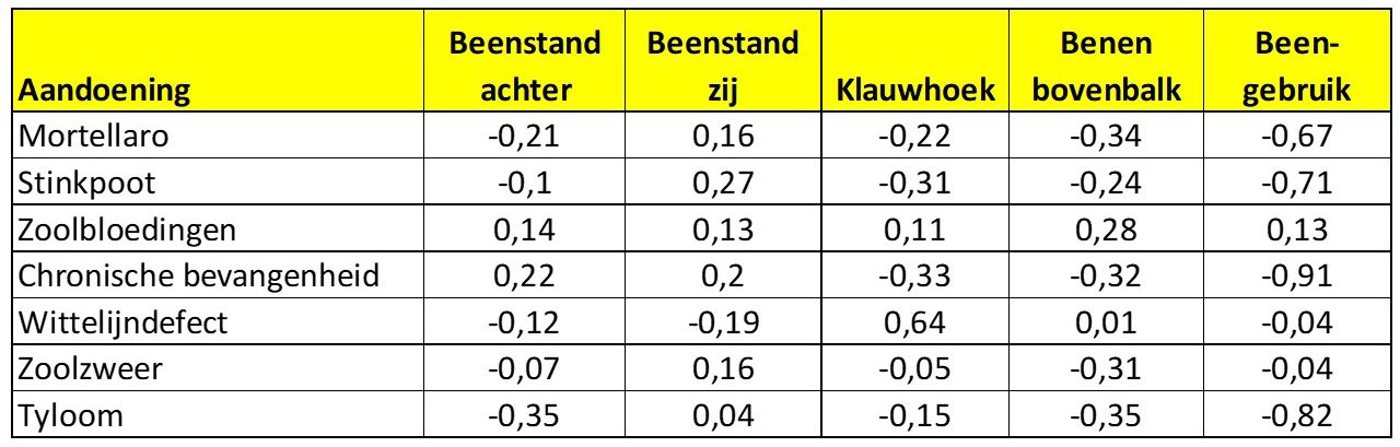 Correlaties van kenmerken voor de bouw van benen en klauwen met klauwaandoeningen (bron: Kamphuis, C. et al., 2004)