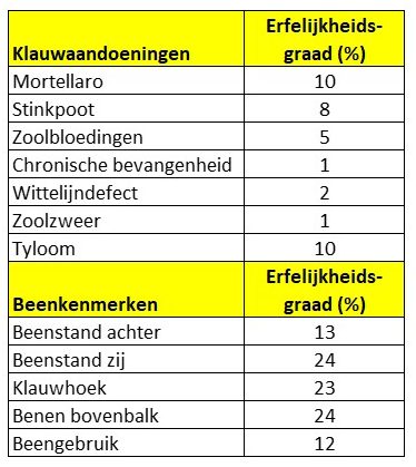 In de hiernaast staan de erfelijkheidsgraden van een aantal klauwaandoeningen en van kenmerken van benen en klauwen. De verschillende klauwaandoeningen hebben verschillende erfelijkheidsgraden omdat ze door meerdere en andere factoren worden bepaald. Het is dus niet alleen de erfelijkheid wat telt, integendeel, de andere factoren zijn zeker zou belangrijk. Toch mag een erfelijkheidsgraad van 10% zoals bij Mortellaro en Tyloom niet worden onderschat. Ze betekenen dat de invloed relatief groot is en dat fokken op een lage gevoeligheid een wezenlijke bijdrage kan leveren aan het geheel van maatregelen. Dat is bij een lage erfelijkheidsgraad veel minder het geval omdat die vaak erg indirect is dus niet zozeer met de aandoening zelf te maken heeft maar met factoren die de kans op de aandoening vergroten. Daarbij is de invloed van de omstandigheden dus veel belangrijker.