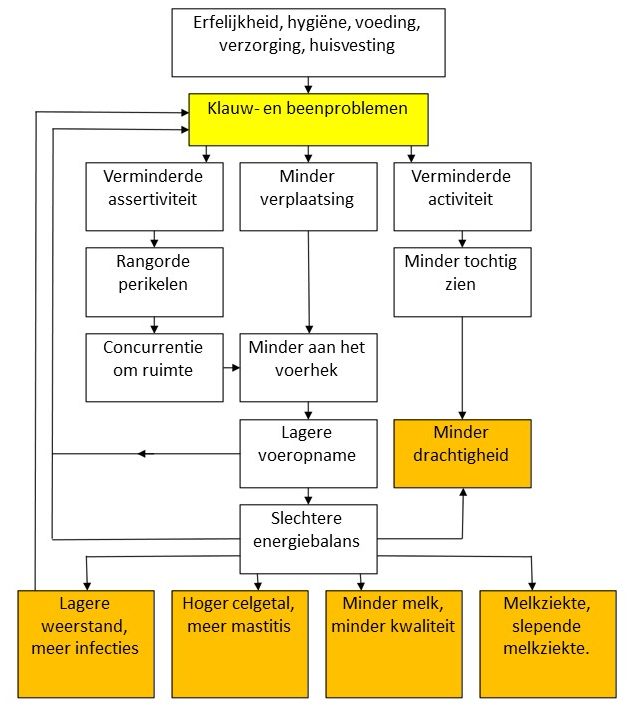 Klauwproblemen veroorzaken een serie kettingreacties die van kwaad naar erger gaan. De koeien komen minder graag uit de box, komen minder vaak naar het voerhek, de voeropname vermindert en de melkproductie daalt. De lagere voeropname kan op zijn beurt voor allerlei stofwisselingsproblemen leiden. De mogelijke reacties kunnen dus een heel verschillend beeld geven. Deze worden in de praktijk vaak onvoldoende onderkend net als de kosten daarvan. De melkderving als gevolg van de klauwproblemen is daarvan vaak de grootste kostenpost. Klauwproblemen komen soms al voor bij drachtige pinken en die kunnen daar de rest van hun leven last van hebben. Een onderzoek in 2003 op 366 bedrijven wees uit dat acute klauwbevangenheid, stinkpoot en Mortellaro de meest voorkomende aandoeningen zijn. Ook anno 2021 is Mortellaro nog steeds een hardnekkig probleem op veel bedrijven.