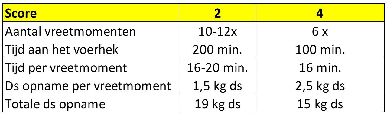 In deze tabel is weergegeven wat de gevolgen voor de voeropname zijn bij weinig klauwproblemen (2) en ernstige klauwproblemen (4). Het aantal vreetmomenten daalt, de vreettijd wordt korter, de droge stofopname wordt minder en dat leidt weer tot voedingsgerelateerde problemen, waaronder opnieuw klauwproblemen. Maar ook problemen als verminderde vruchtbaarheid en slepende melkziekte, hoger celgetal en meer mastitis door de verminderde weerstand. De slechtere energievoorziening kan ook weer leiden tot specifieke klauwaandoeningen.