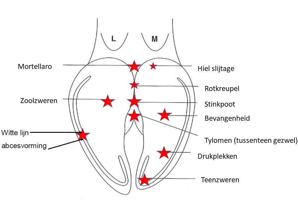 | Zoolzweer | Niet besmettelijk. Zoolzweer meestal op het midden van de klauw (onder het klauwbotje). Erg kreupel. | Kan veroorzaakt zijn door kneuzingen (mechanische belasting) en slechte klauwkwaliteit door voeding (NEB eerste 100 dagen van de lactatie, slechte structuurvoor-ziening en tekort aan mineralen en spoor- elementen). | Bevangenheid. Te weinig structuur in het rantsoen. Negatieve energie balans. Endotoxinen door pensverzuring, mastitis en baar-moederontsteking. Gladde vloeren. Obstakels. Te weinig liggen in de box. |