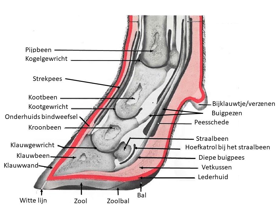 De klauw bestaat uit veel verschillende onderdelen zoals de botten, de pezen, beschermende tussenlagen, de hoornen klauwwand etc. (zie de figuur hieronder). Alle onderdelen tezamen zorgen voor het functioneren van de klauw. Wanneer onderdelen niet goed ontwikkeld zijn, een verkeerde vorm of afmeting hebben, niet goed op elkaar zijn afgestemd, overbelast of geïnfecteerd raken dan heeft dat meerdere gevolgen voor de klauw zelf. Een aandoening of een fout in de bouw kan bijvoorbeeld zorgen voor necrose, zweren kunnen botontsteking (feit) tot gevolg hebben, een scheve stand een plaatselijke overbelasting, chronische aandoeningen en zo meer. Wil je klauwproblemen voorkomen dan is de uitdaging om alle onderdelen optimaal te houden en overbelasting te voorkomen.