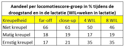 In de loop van de lactatie neemt het aantal koeien dat niet kreupel is af. De kreupelheid neemt dus toe en ook de ernst van de kreupelheid. Dat begint al in de droogstand. Het aantal stappen dat een kreupele koe zet is flink minder dan bij de gezonde koeien. Ze komen minder naar het voerhek en vreten ook per keer korter. Dat heeft gevolgen voor de voeropname, de BCS, de melkproductie en de weerstand. Kreupele koeien worden kwetsbaarder en er ontstaat als het ware een kettingreactie aan andere problemen.
