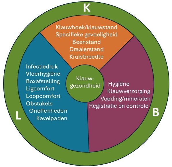 Het zal duidelijk zijn, een goede klauwgezondheid vraag om aandacht en maatregelen op verschillende fronten en het gaat erom de juiste aanpak met de juiste combinatie van maatregelen te ontwikkelen voor de klauwgezondheid. Het KBL-principe geeft daarvoor goede handvatten. Het gaat ook hier weer om de drie hoofdfactoren die verantwoordelijk zijn voor de problemen en die dus ook kunnen dienen als uitgangspunt voor de maatregelen: