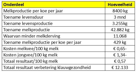Onderzoek heeft uitgewezen dat de directe kosten van klauwproblemen gemiddeld € 56,- per koe per jaar bedragen. De kosten op individuele bedrijven kunnen oplopen tot wel € 150,- per koe per jaar. De gederfde melkopbrengst is de grootste schadepost bij klauwproblemen. Worden de gevolgen voor de levensduur en de noodzakelijke vervanging meegerekend, dan zijn de kosten nog veel hoger (zie tabel hiernaast)