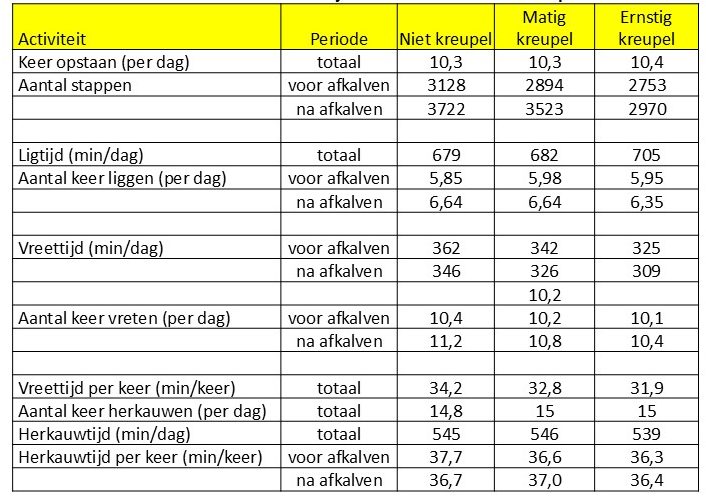 De relatie tussen activiteiten van koeien en de mate van kreupelheid.