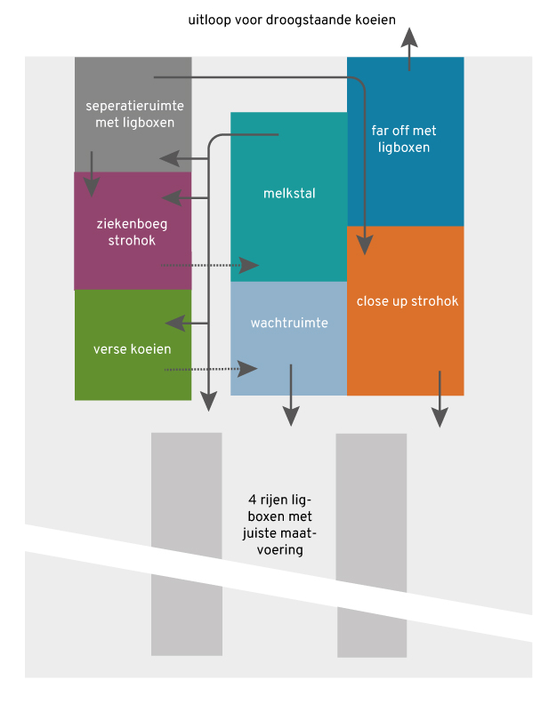 Om een goed beeld te kunnen krijgen van de eisen voor de ideale stal, is het handig om in concepten te denken. Bijvoorbeeld het denkconcept voor een AMS-/robotstal. Het principe van de stal is dat 80% van de werkzaamheden plaats kunnen vinden rond het AMS/robot met korte looplijnen voor de veehouder en de koe, met maximaal gebruik van separatiemogelijkheden om probleemkoeien, koeien die drooggezet moeten worden of na afkalven een tijdje op stro moeten blijven, automatisch te selecteren. Achter het AMS worden daarvoor de ruimtes gemaakt. Zowel vanuit de verse groep als vanuit het strohok kunnen koeien het AMS/de robot bereiken. Vanuit de separatieruimte kunnen de koeien terug in het koppel, naar het strohok of, als ze droog gezet zijn en de klauwen zijn behandeld, naar de droogstandsgroep. Dit denkconcept is ook van toepassing op een 2+2 stal (met de voergang in het midden) of een 0+6+0 stal.