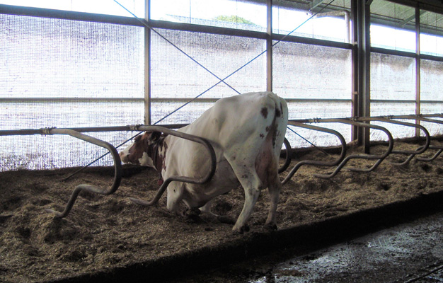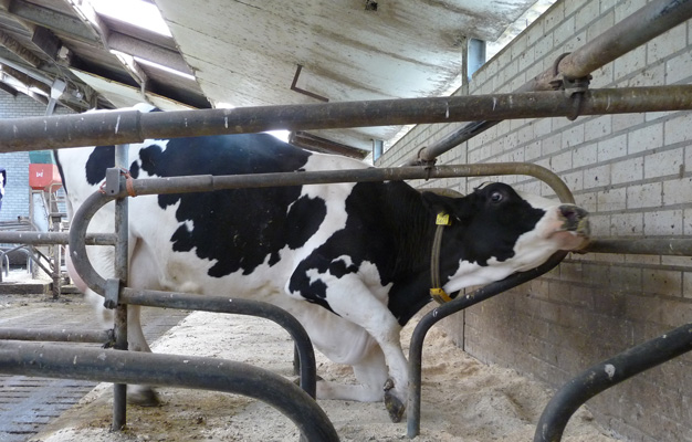 Er is voldoende strekruimte maar de koe wordt gehinderd door de schoftboom. Ze kan niet opstaan zonder achteruit te gaan wat geheel tegen haar natuur ingaat. Ze wil een stap naar voren kunnen zetten. Het helpt wel dat ze een goede grip heeft in het ligbed maar een gebogen schoftboom kan hier het verschil maken.