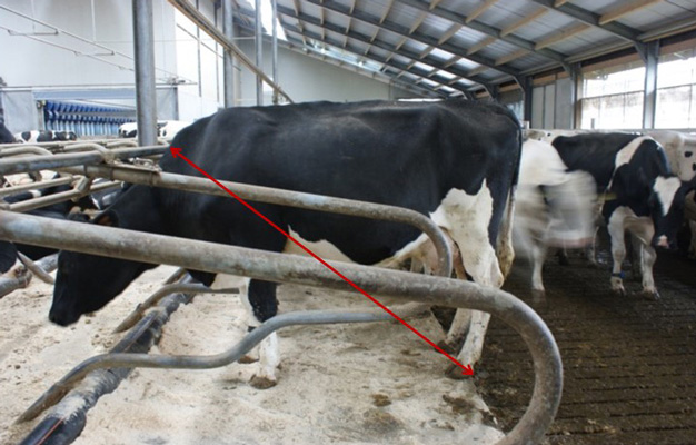 Een koe die geen ruimte heeft in de lengte zal schuin gaan liggen. Ze kan ook alleen maar schuin opstaan en probeert het ijzerwerk als houvast (hefboom) te gebruiken. Een gebogen (gegolfde/gekartelde) schoftboom zal niet helpen omdat ze toch niet met de kop vooruit kan. Dit zorgt voor overbelasting en beschadigingen. In dit soort situaties gaan koeien niet graag liggen en als ze liggen staan ze ook moeilijker weer op. Ze komen minder snel aan het voerhek en naar de melkrobot of ze blijven staande wachten.