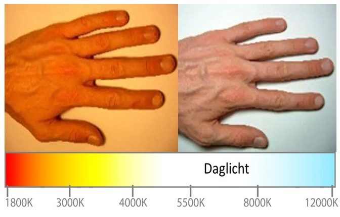 De kleurtemperatuur geeft de “warmte” van het licht aan en hoe goed je iets kunt zien en wordt uitgedrukt in Kelvin (in duizendtallen). Geel/rood licht heeft een lagere kleurtemperatuur (<4.000) en je kunt er minder goed details mee onderscheiden. We noemen dat wel warmer licht, denk aan het licht van een brandende kaars. Blauw licht heeft een hoge kleurtemperatuur (>8.000) en je kunt er beter bij zien. We noemen dat koud licht. Daglicht heeft 6.500 Kelvin, wit licht. Bij een lage kleurtemperatuur (kaarslicht) heb je meer lichtsterkte nodig om hetzelfde te kunnen zien als bij een hoge kleurtemperatuur (een lamp met wit licht).