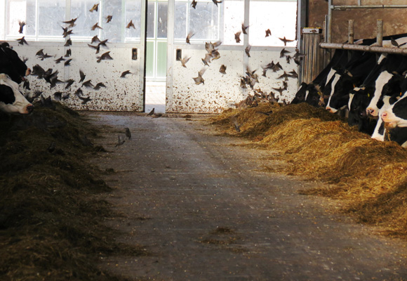 In de stal kunnen vogels infectieziekten overbrengen. Bovendien kunnen ze met vele honderden of zelfs duizenden aan het voerhek het krachtvoer en maispitten uit het rantsoen halen. Dat verlaagt de voederwaarde behoorlijk omdat ze het beste uitselecteren. Daarbij zijn ze de koeien vaak wel voor. Dus houd ze buiten de deur.
