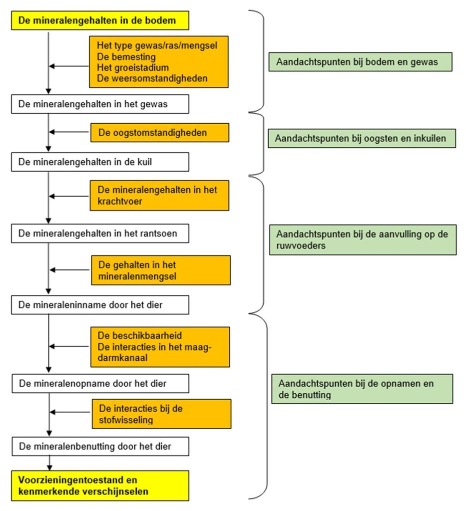 De gehaltes aan mineralen kunnen per kuil en per seizoen sterk verschillen. Dat komt door de invloed van allerlei andere factoren in de bodem en het gewas. De aanvoer en benutting van de mineralen in het rantsoen zijn vervolgens afhankelijk van veel factoren op de weg van bodem tot stofwisselingsproces in de koe. Die factoren bepalen uiteindelijk wat de voorzieningentoestand is van de koe en of er sprake is van tekorten of overmaten. In bijgaand schema is de route weergegeven. Per stap zijn de belangrijke aandachtspunten benoemd.