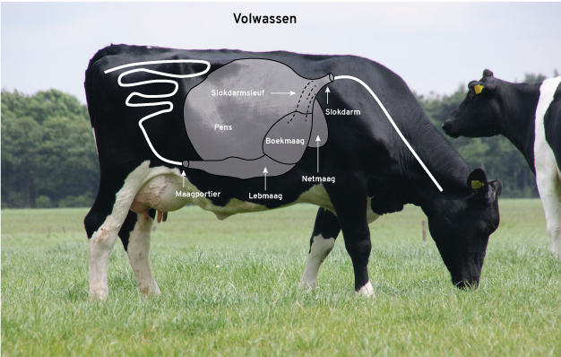 Tijdens de fermentatie in de pens worden verschillende vluchtige vetzuren geproduceerd. De drie belangrijkste zijn azijnzuur (65%), propionzuur (20%) en boterzuur (15%). Makkelijk afbreekbare producten blijven slechts kort in de pens. Structuurrijke producten blijven ongeveer 20 uur in de pens. Een onevenwichtige zuurvorming kan pensverzuring veroorzaken. Daar gaan we in § 5.5 dieper op in. Alle onbestendige producten, dus producten die niet bestand zijn tegen het milieu in de pens zoals suikers, onbestendig zetmeel en onbestendig eiwit, worden gefermenteerd.