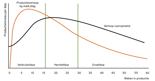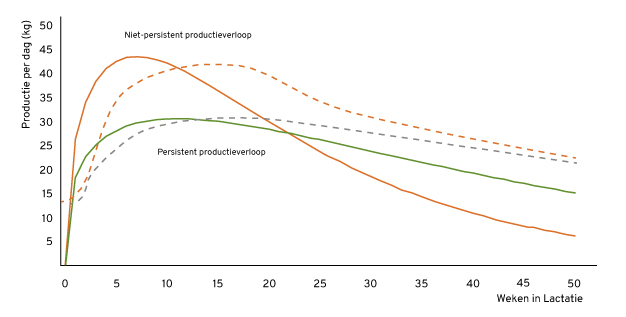 In de grafiek een voorbeeld van het verloop van de melkproductie en de voeropname in de verschillende lactatiefasen. Het verloop van de fasen is voor elk productieniveau vergelijkbaar. Alleen persistente koeien is het verschil tussen de energieopname via het voer en de afgifte via de melk in alle drie de fasen (veel) kleiner, waardoor de kans op problemen met de weerstand, gezondheid en vruchtbaarheid kleiner zijn.