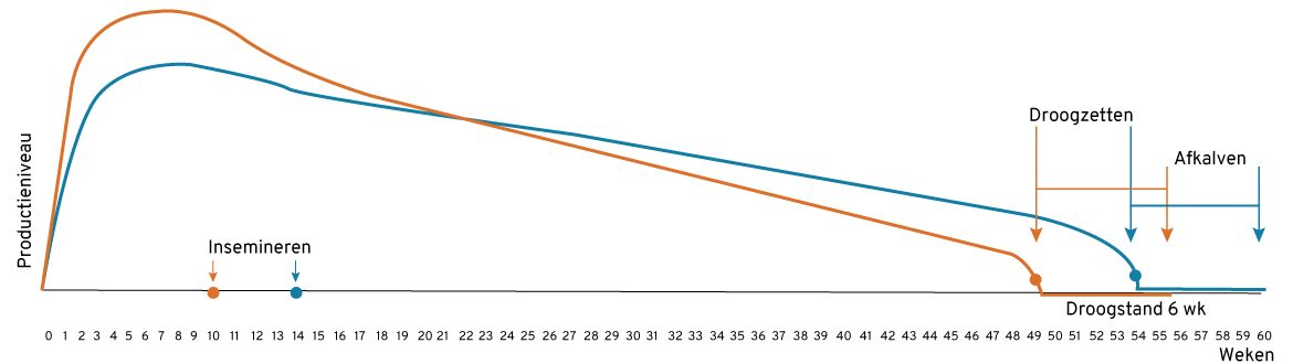 - Persistente koeien kunnen het best na de topproductie, in de herstelfase, geïnsemineerd worden omdat de productie over een langere periode in die fase relatief hoog blijft;